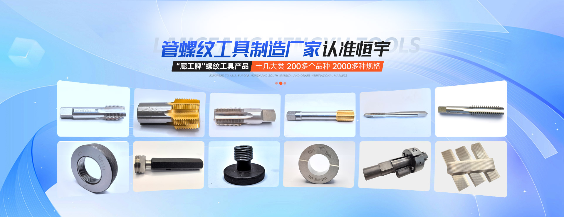 “廊工牌”螺紋工具產品,包括英標、美標、德標管螺紋絲錐、公制螺紋絲錐、螺旋槽絲錐、擠壓絲錐、螺尖絲錐、板牙片及專用量具、檢具和其它與螺紋加工相關聯的專用設備,共十幾大類、200 多個品種、2000 多種規格
